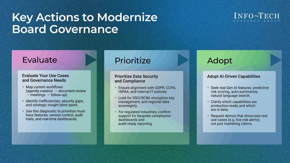 - Info-Tech Insight: Align board management requirements to director priorities and use a structured, phased selection process to identify secure, AI-enabled platforms that improve governance effectiveness and strategic focus.