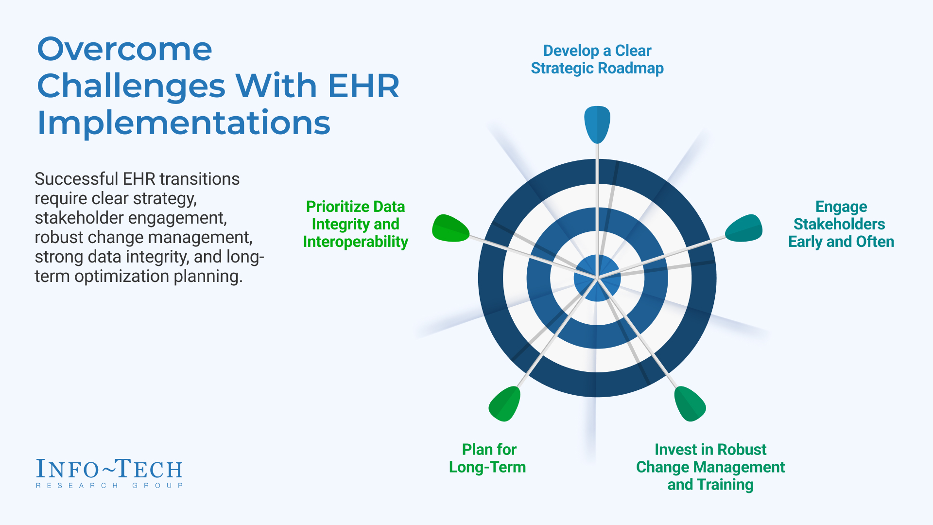 - Organizations face pressure to replace and/or consolidate EHRs to meet demands for interoperability, usability, AI readiness, and cost efficiency.