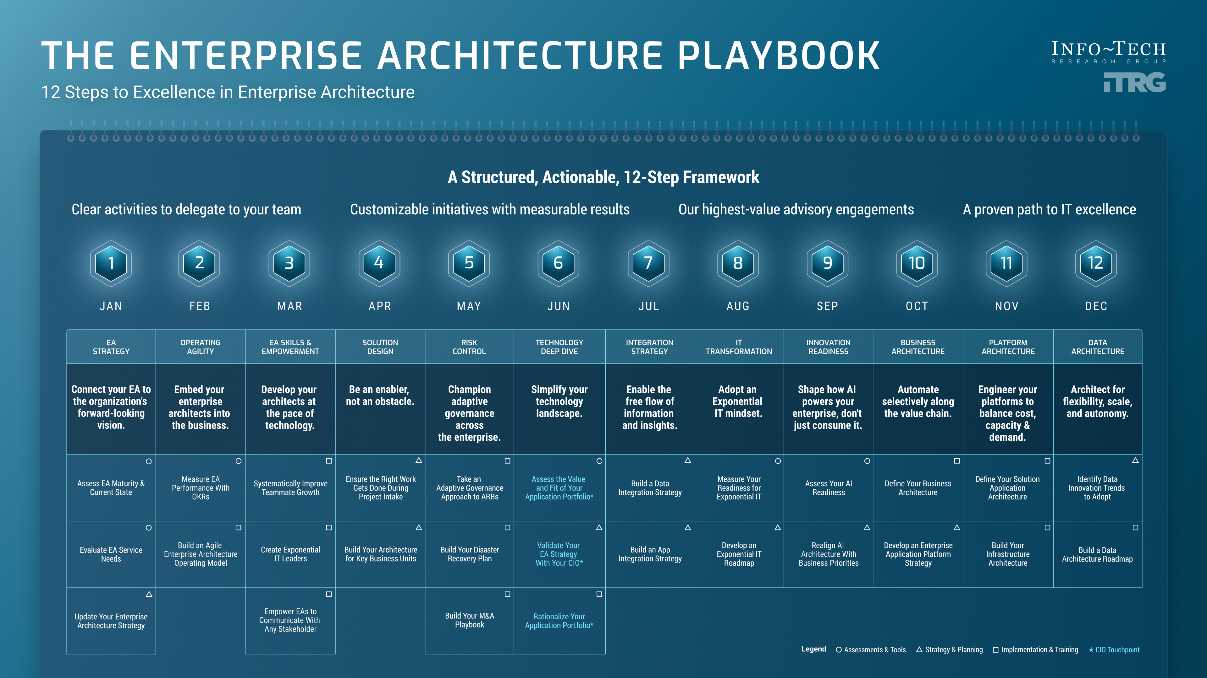 Enterprise architecture (EA) is uniquely complex, sitting at the intersection of strategy and execution across multiple domains. EA leaders are faced with high and rapidly changing expectations from their organizations as they prepare to play an outsized role in enabling transformation and innovation. Our Enterprise Architecture Playbook offers EA leaders a structured approach to providing the vision, integration, and guardrails that keep IT and the organization in seamless alignment as they navigate transformation.