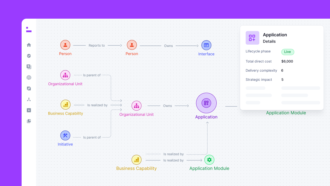 Ardoq is a dynamic, data-driven tool for Enterprise Architecture and a key tool for your digital transformation journey. The software helps organizations and businesses plan, execute, and predict the impact of change across their people, projects, strategies, processes, applications, infrastructure, and capabilities. With Ardoq, fresh data creates a dynamic overview that provides insights for better decisions. Through the aid of dashboards, interactive visualizations, and diagrams, users can focus on understanding interdependencies between technology and people, and less time documenting.